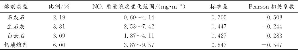 某鋼廠1號燒結(jié)機(jī)中使用的熔劑主要有石灰石、生石灰、白云石,按照熔劑的主要成分可以分為鈣質(zhì)熔劑與鎂質(zhì)熔劑。表2為該鋼廠的各種熔劑的使用比例與燒結(jié)煙氣中NOx質(zhì)量濃度的相關(guān)性分析結(jié)果。