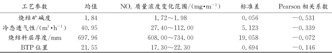 二、工藝參數(shù)對NOx排放的影響規(guī)律燒結(jié)工藝因素重點(diǎn)考察燒結(jié)礦堿度、冷態(tài)透氣性、料層厚度與燒結(jié)終點(diǎn)(BTP)位置4個(gè)參數(shù)對煙氣NOx排放的影響。相關(guān)性分析結(jié)果列于表4中。
