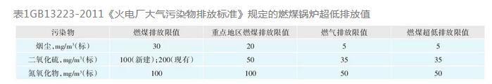 GB13223-2011《火電廠大氣污染物排放標準》確定的燃煤鍋爐超低排放值見表1。