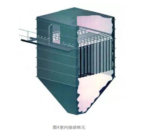 2005年,結合琉璃河水泥廠窯尾電除塵器改造,我們開始推出凈氣室室內換袋結構的袋除塵器(圖4),大大降低了整機漏風率。